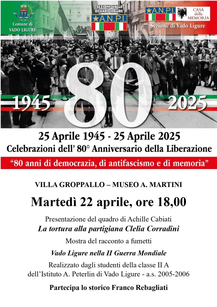 Durante l’incontro verrà presentato il quadro dell’artista Achille Cabiati, intitolato “La tortura alla partigiana Clelia Corradini”. Seguirà l’inaugurazione della mostra del racconto a fumetti “Vado Ligure nella II Guerra Mondiale”,